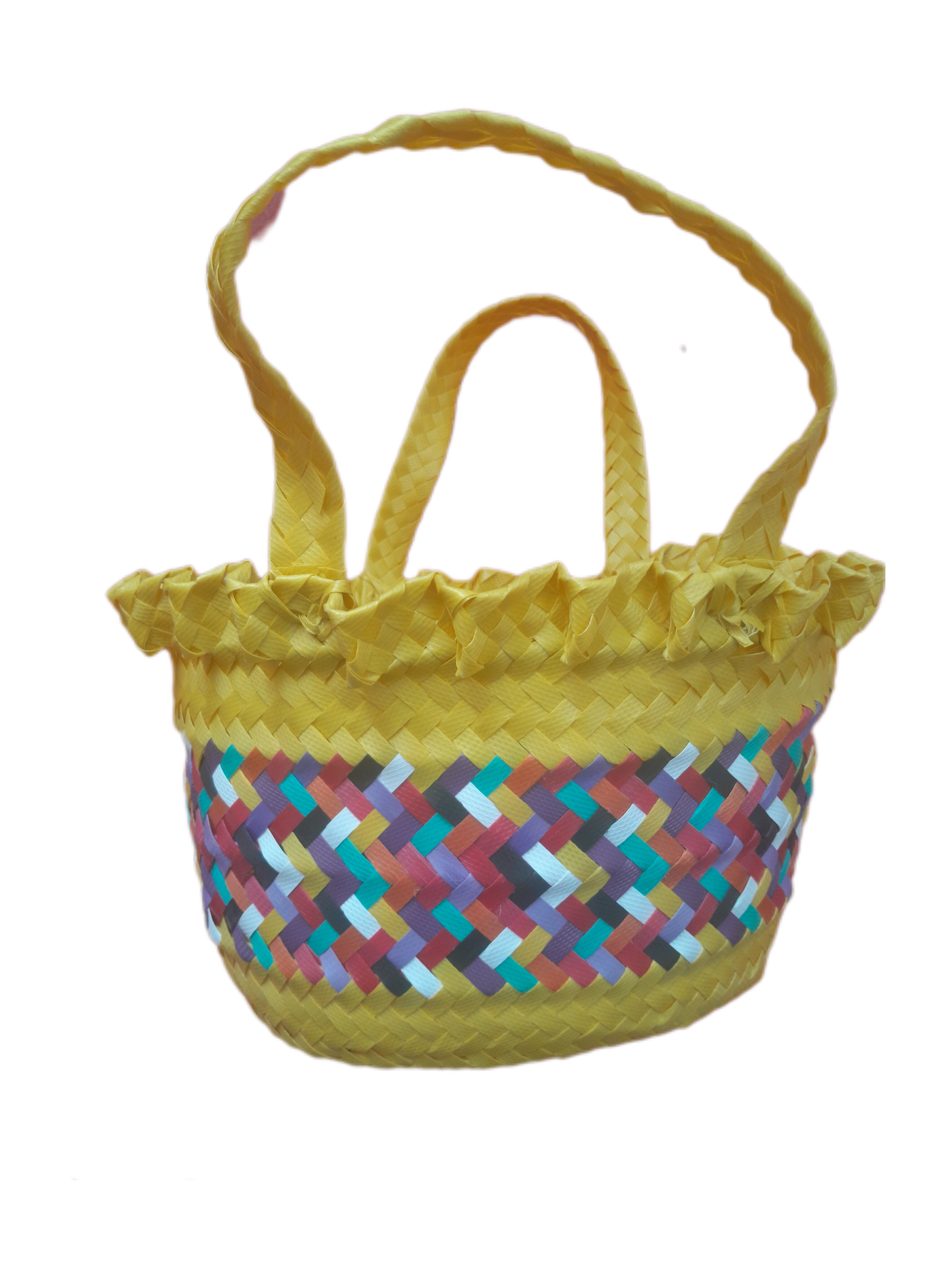 سبد و ساک حصیری دستبافت تاروپودی تسمهای رنگ زرد سایز 15 سانتی متر